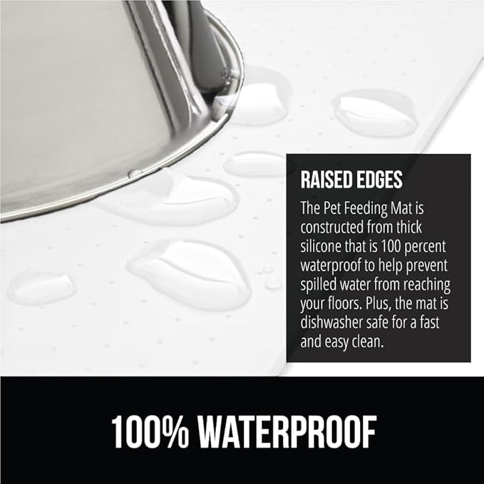 - 100 PERCENT WATERPROOF FOR ULTIMATE FLOOR PROTECTION: some of the cutest pets can be the messiest eaters and drinkers; mat is constructed from 100% waterproof silicone that is dishwasher safe for an easy clean; mat features a 1/8-inch-thick raised edge around its border that helps to contain liquid runoff to the top of the mat; mat acts as a barrier to help prevent spills from reaching your floors and causing potential damage
