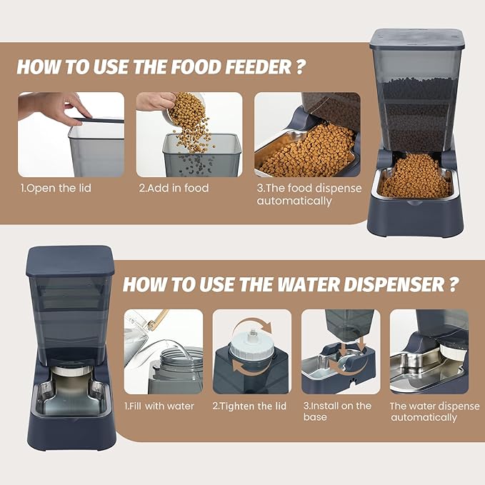 - 【Large Capacity】--- 5.4L / 1.4Gal Capacity,Works for small & medium & big -sized dogs and adult cat. It slowly refills water/food to the bowl by gravity and extends the refill time. The daily water/food supply for pets will be sustainable and very suitable for pet owners to travel or busy work.