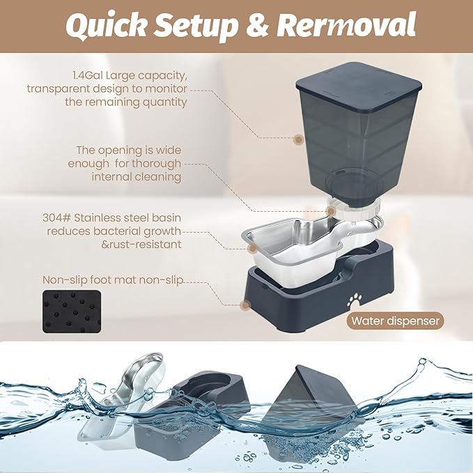- 【Enthusiastic eaters-Friendly】---Engineered with a dual-angle anti-tip base, It maintains its stability with ease, withstanding accidental bumps from dogs. And textured silicone pads prevent slippery disasters.The water bottle is tightly integrated with the base, and the deepened water bowl prevents water from overflowing, providing your pet with a better drinking and food feeding experience.