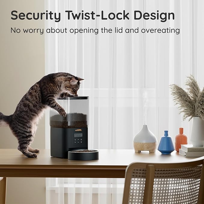 - Reliable Twist-Lock Storage: The automatic cat feeder comes with a unique twist-lock lid, ensuring the perfect amount of dry kibble (sized 0.07-0.47in / 2-12mm in diameter) is securely stored. This design preserves the crunchiness and flavor of the food while keeping it safe from curious paws.