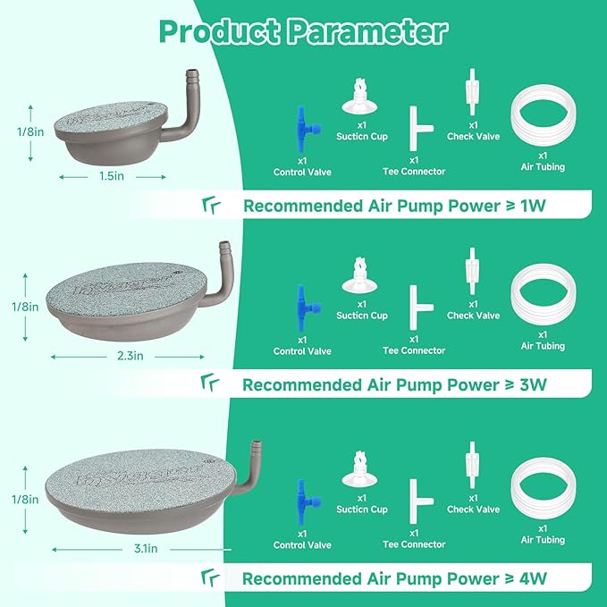 - Complete Air Stone Kits: This fantastic aquarium air stone kit includes a 2.3 inch nano air disk stone, 1 control valve, 1 check valve, 1 suction cup, 1 T-shaped connector, 1 4mm standard ait tubing. Recommended air pump power: ≥ 3W. PS: The deeper the water, you may need to use a larger wattage air pump to drive it. soak the stone completely in water for 1 hours before use; clean it with a brush after a period time of use.
