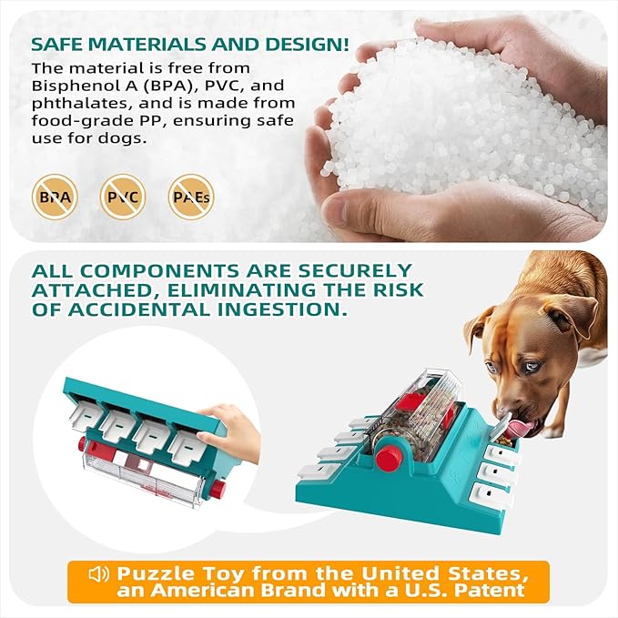 - [Innovative U.S. Design with U.S. Brand and U.S. Patent] KADTC, an American brand, proudly introduces this innovative dog puzzle toy, designed and patented in the USA. Featuring a unique centralized food dispensing system, this toy not only provides engaging play but also helps your dog develop a slow-eating habit, improving digestive health. It holds up to 16.4 ounces of food and combines Level 1 and Level 2 difficulty gameplay in one toy, offering a customizable challenge for your dog. Perfect for stimulating your dog’s mind, this toy is a thoughtful gift for birthdays, holidays, and special occasions.