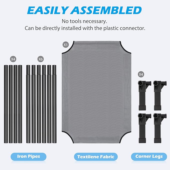 • Easy to Install: The cooling dog cot can be installed without the use of any tools, screws and can be installed directly with the plastic connector. It only takes a few minutes of your time, and presto. It's up and ready for your pet to enjoy in. Perfect for any indoor space or outdoor adventure.