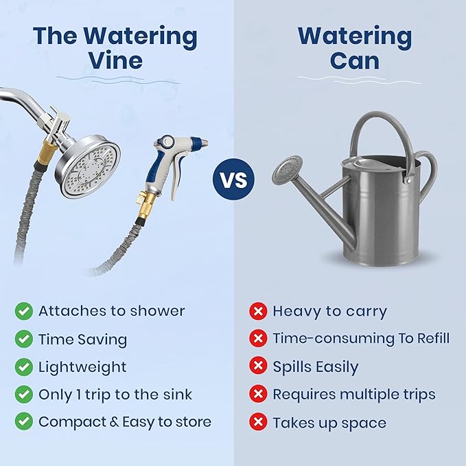 - Great For Apartment Living - Elevate your apartment living with The Watering Vine. While most apartments don't have access to an outdoor garden hose attachment, The Watering Vine is renter friendly and will easily connect a long shower hose to the shower adapter. The Watering Vine can make apartment living easier with watering plants, and can be used as a pet shower attachment, or even to fill up a fish tank.
