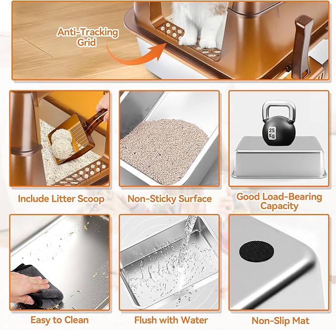 - Easy to Clean & Odorless: This Covered litter box is made of high-quality ABS material and corrosion-resistant stainless steel. Compared with plastic cat litter boxes, the stainless steel cat litter box will not absorb any odor. The smooth surface is non-stick and easy to clean.