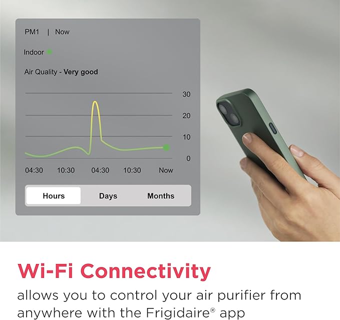 - Wi-Fi Enabled Control: Manage your air purifier from anywhere with the Frigidaire app, allowing you to set schedules, track air quality, adjust settings, and monitor filter life effortlessly