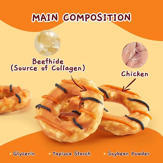 - LONG LASTING DOG CHEWS: Our chicken wrapped collagen donuts are durable and long lasting, which encourage chewing and keep your dogs busy and satisfied, also relieve their pressure