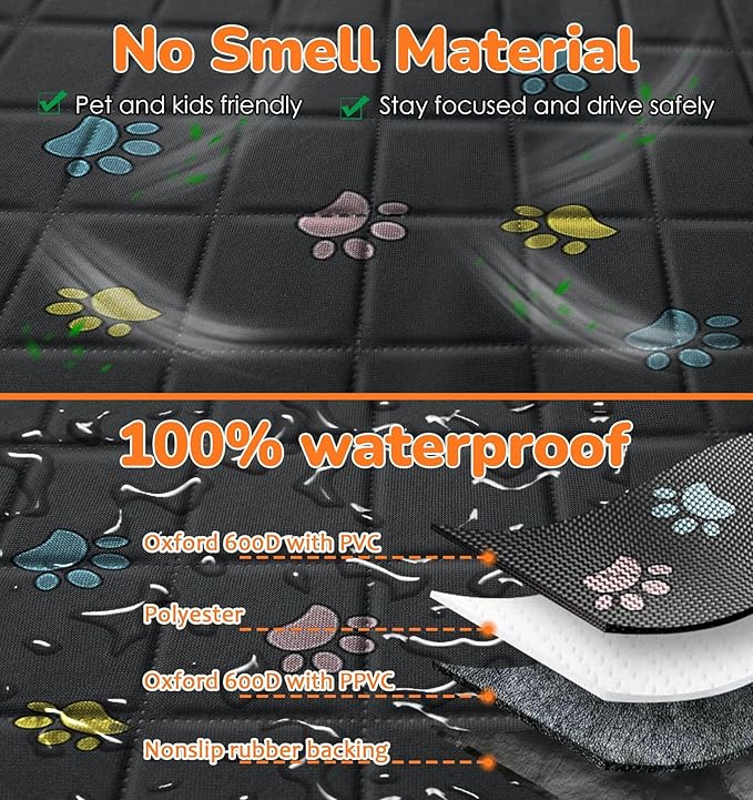 - WATERPROOF & SCRATCHPROOF DOG SEAT COVER: Made of 600D Oxford material, this dog back seat cover is durable, waterproof, and scratch-resistant. Totally keep your seat from any dirt, liquid, scratches, hair & fur, etc. No more endless sweep