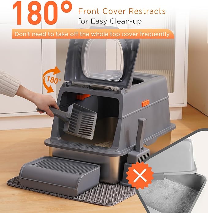 Citylife Stainless Steel Cat Litter Box with Lid, Front & Top Entry Extra Large Metal Kitty Litter Box Enclosure with Scoop & Double Layer Mat, Anti-Leakage, Non-Sticky, Dark Grey
