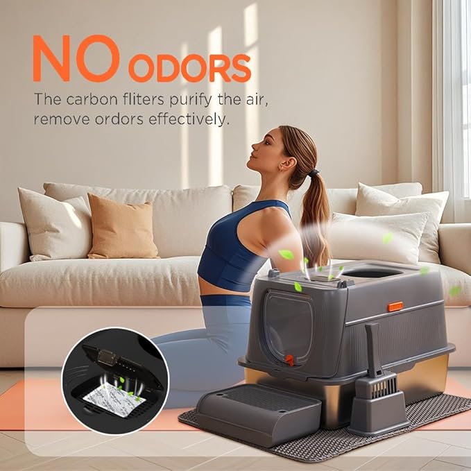 - 【Odor-Free Enclosed Litter Boxes with Carbon Filters】Equipped with carbon filters, this enclosed litter box effectively neutralizes odors, keeping your home fresh. Its sealed design provides privacy and cleanliness for your cat.