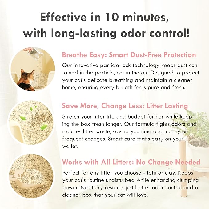 - Long-Lasting Freshness, Less Waste – Each 10g packet refreshes 6 to 9 lbs of litter, extending its lifespan and reducing waste. Use more if necessary for litters with poor odor control.