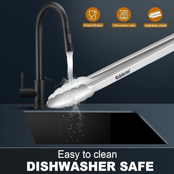 - Heat Resistant Up To 600°F - Eddeas Heavy Duty BBQ tongs heat resistant up to 600°F, Cooking tongs have ergonomic handles to ensure good grip and control, avoid burns and provide greater comfort. The metal tongs are super heat resistant and easy to clean, simply hand wash or put in the dishwasher.