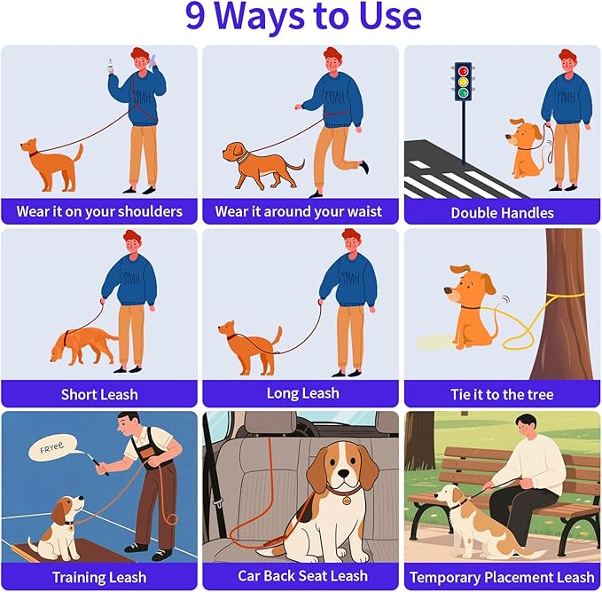 Hands-Free Dog Leash with Adjustable Length 6-9FT + Dual Padded Handles Reflective Safety for Walking, Jogging & Training | Suitable for Medium to Large Dogs & Puppies Purple-L