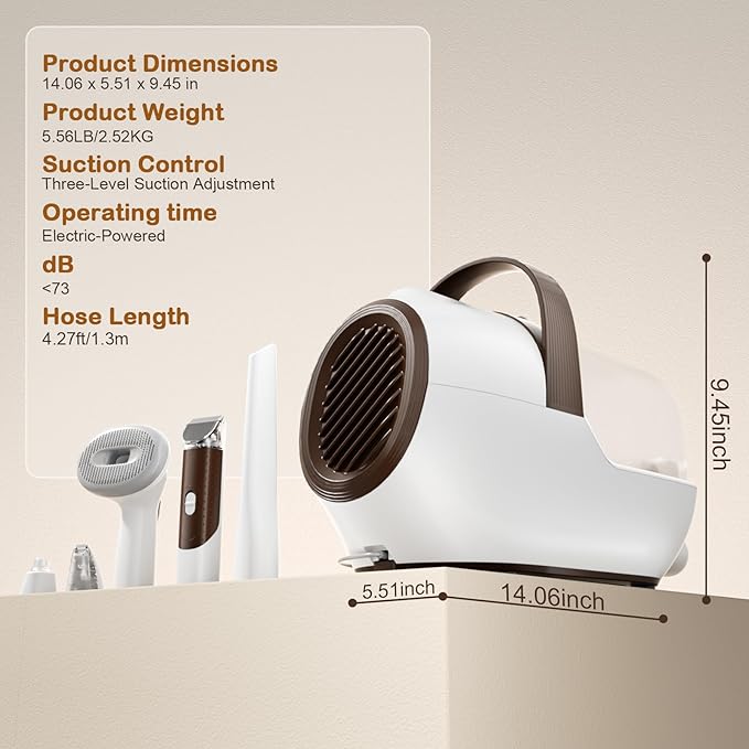 - đQuiet & Stress-Free Grooming: Our pet grooming vacuum for dogs features a low-noise design to keep your pet calm and comfortable during grooming. With 3 adjustable suction levels, your dog will feel relaxed and not scared, even at the highest setting, where noise is below 73dB. This makes it the perfect dog hair trimmer for pets who are sensitive to loud sounds.