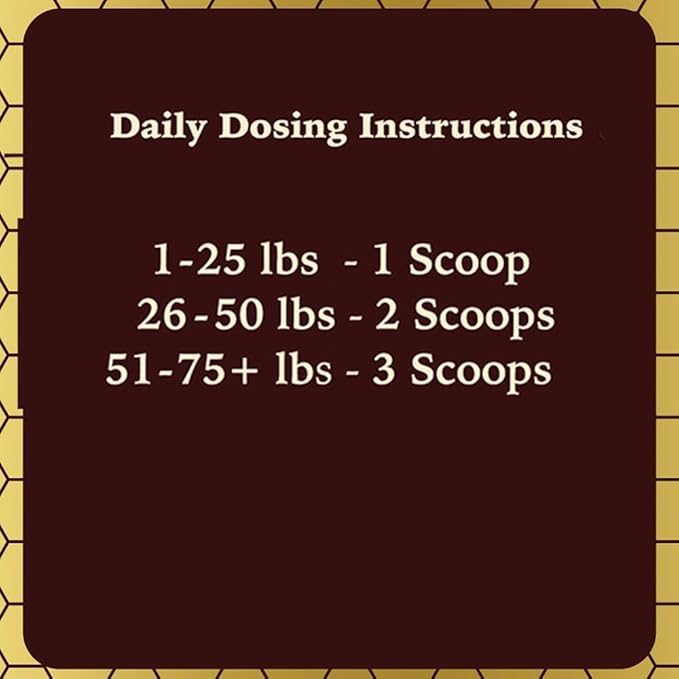 - DIRECTION FOR USE: 1-25 lbs - 1 scoop daily; 26-50 lbs - 2 scoops daily; 51-75+ lbs - 3 scoops daily. Begin with half the suggested amount when introducing a new supplement to your dog’s diet. Gradually increase to the suggested daily amount. For larger dog dosing, amounts can be split between AM and PM.