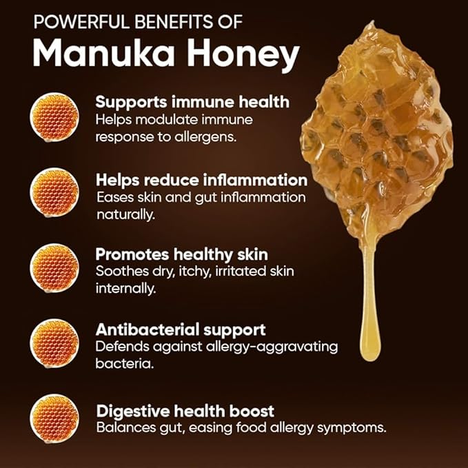 - Healing and Relief from Within – Manuka Honey and Vitamin C provide natural antimicrobial, anti-inflammatory, and skin-repairing benefits to soothe irritation and support long-term allergy relief.