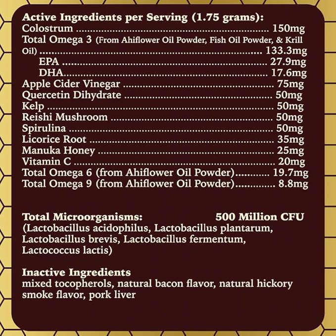 - Immune and Gut Defense – Colostrum, Apple Cider Vinegar, and a 500 million CFU probiotic blend work together to balance the immune system and support digestive health, helping to ease food and environmental allergies.