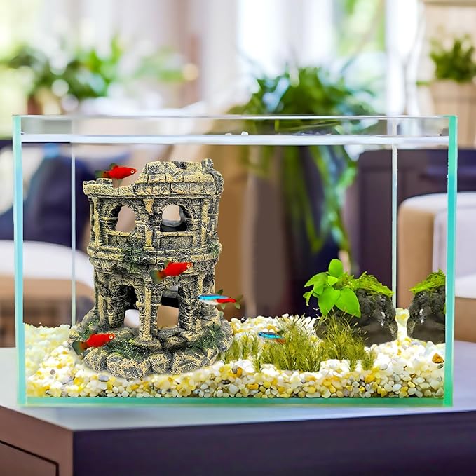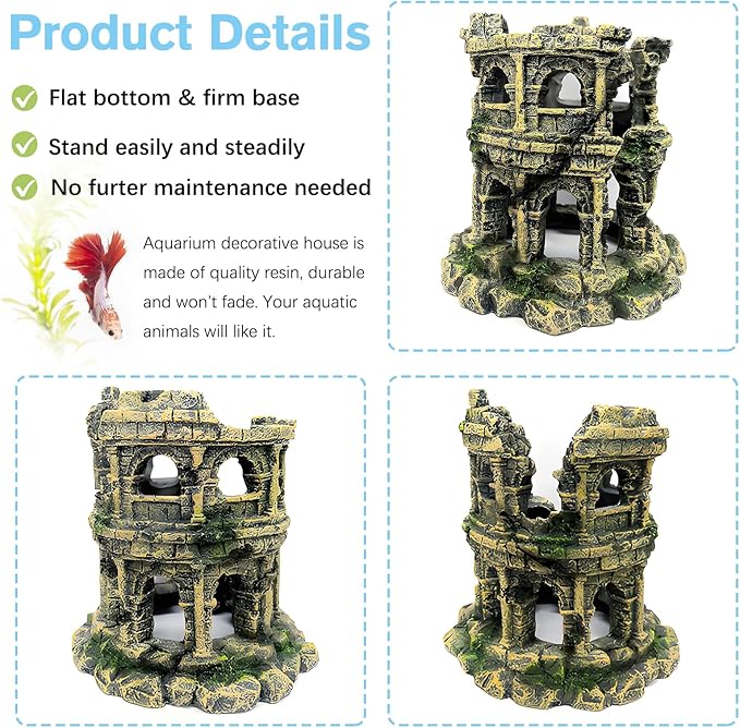 - A Favorite of Small Fish: The fish tank aquarium accessory has many holes to attract your cute pet betta or other small fish in and out to sleep, rest, hide, play. Beautiful fish swimming in the ruins of an ancient Roman castle, what a creative landscape. Bright decorations add more joy to their lives