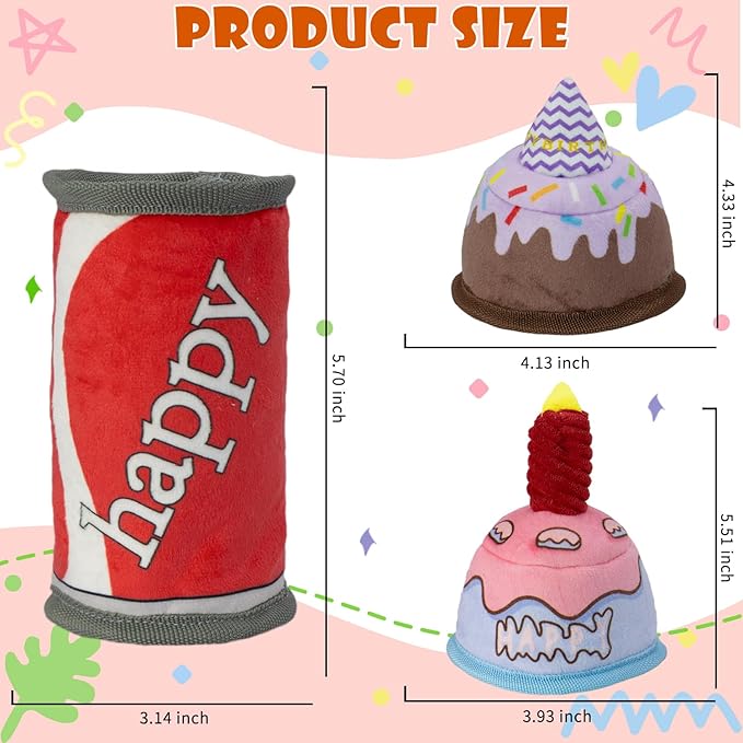 - DOG BIRTHDAY GIFT: Includes one birthday cake toy and one soda can toy. Features double-stitched seams for maximum durability, making it the toughest in its category. With festive prints and ultra-soft fabric, it creates a unique experience for your dog's birthdays and special occasions!
