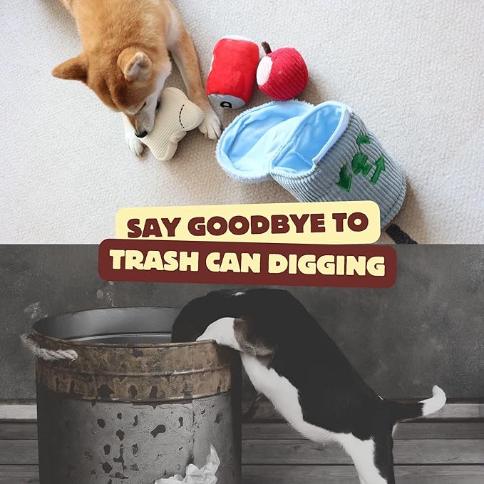 - đŸă4-in-1 Interactive PlayăThis interactive dog toys with squeaker includes a plush trash can and 3 surprise toys for endless entertainment. They can attract puppy's attention and avoid them from damaging furniture and other home items.