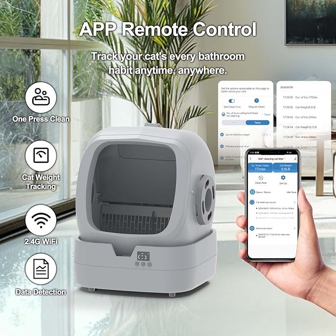 Automatic Self-Cleaning Cat Litter Box with APP-Controlled, Weight Tracking ā 86L Ultra-Quiet, Smart Health Monitor, and Safe Anti-Pinch Design (Assembly Required) -Light Grey