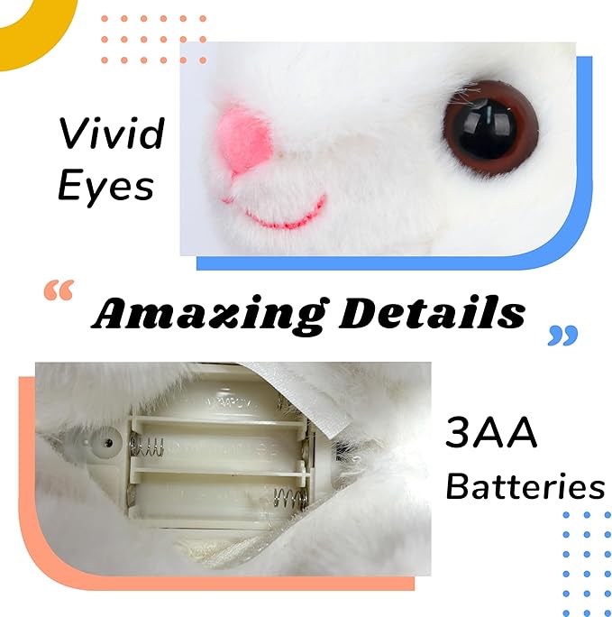 - ABOUT WALKING BUNNY: This adorable bunny measures about 12 inches tall from ears to toes, the portable size and light weight can let kids take it everywhere and play with. Hopping bunny could attract children's attention easily, it gives you more space and time to do your own thing. Inspire your children and surprise friends or guests with an ideal interactive gift for any occasion. Let your kids’ mind run freely, connect their imagination and enjoy happy game time.