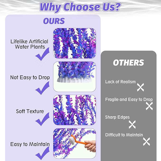 - RELIABLE MATERIAL : Our fake water plant leaves and roots are made of soft plastic material that won't affect the water quality. The leaves do not have sharp edges and have a soft texture, which can effectively avoid any physical damage to the fish while swimming or playing, and can better beautify the e-nvironment, maintain stability and not fade. Provide a comfortable and clean living e-nvironment for fish. Whether placed in a saltwater e-nvironment or freshwater e-nvironment, it can be perfectly adapted