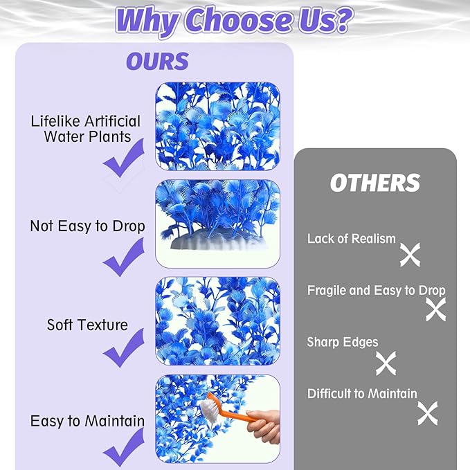 - SAFE AQUARIUM DECORATIONS: Our artificial aquatic plants are crafted from flexible, aquarium-safe plastic that maintains water quality. Featuring smooth edges and a natural texture, these decorations protect delicate fish fins while creating a vibrant underwater habitat. Designed for long-lasting color retention, the realistic foliage remains fade-resistant in both freshwater and marine environments.