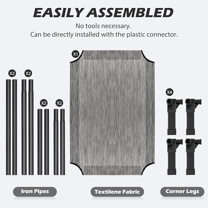 - Easy to Install: The cooling dog cot can be installed without the use of any tools, screws and can be installed directly with the plastic connector. It only takes a few minutes of your time, and presto. It's up and ready for your pet to enjoy in. Perfect for any indoor space or outdoor adventure.