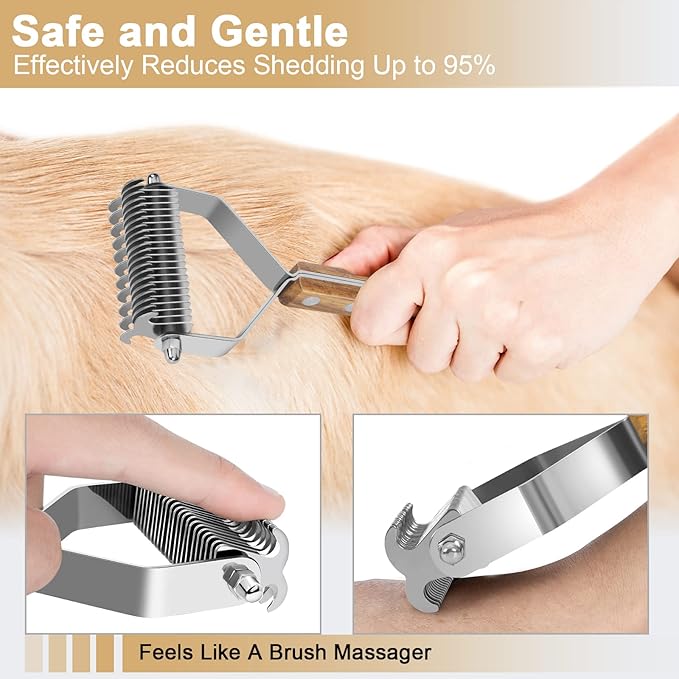 - Dual-Sided Deshedding Blade for Thick & Double Coats: Effortlessly remove loose undercoat and stubborn mats on Huskies, Golden Retrievers, and long-haired cats. Fine + wide teeth adapt to all fur densities, reducing shedding by 80% in minutes.