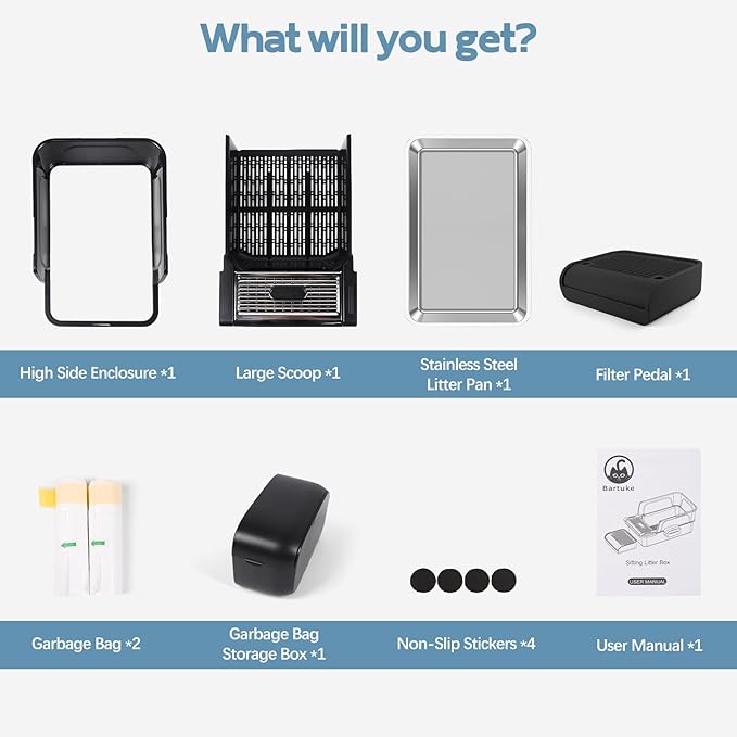 - Package List: Product Size: 23.6"x15.7"x11.8" (LxWxH). Includes High-side enclosure x1, Large scoop x1, Stainless steel litter pan x1, Filter pedal x1, Garbage bag x2, Garbage bag storage box x1, Non-slip stickers x4, User manual x1