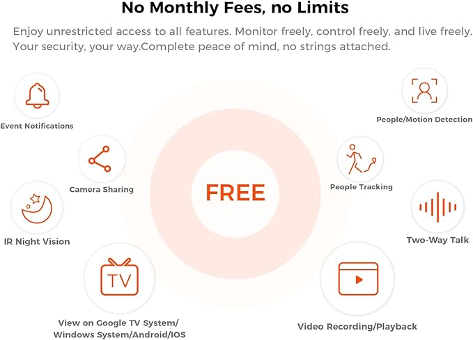 - No Monthly Fees - All Features Included: Access crucial functions like night vision, smart alerts, and live viewing with no monthly fees. This security camera, pet camera, and home security solution includes everything you need without hidden charges.