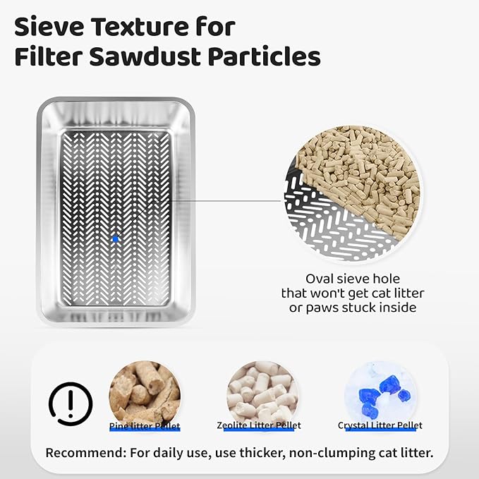 - Sifting Pan for Easy Filtering: Our cat litter box is come with sifting pan with elliptic holes, and does not stuck the non-clumping cat litter and helps filter urine quickly. Large granular cat litter is recommended, such as pine litter pellet