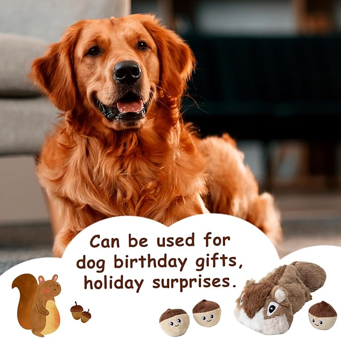 - Funny Dog Toys Great for Multiple Dogs - Squirrel size: 12 x 4.5 x 3.5 inches, Pine Cones size: 2 inches. 3 toys included, each puppy chew toy has one round squeaker. Prefect dog toys for large dogs and good traing toy for puppies small, medium and large dogs