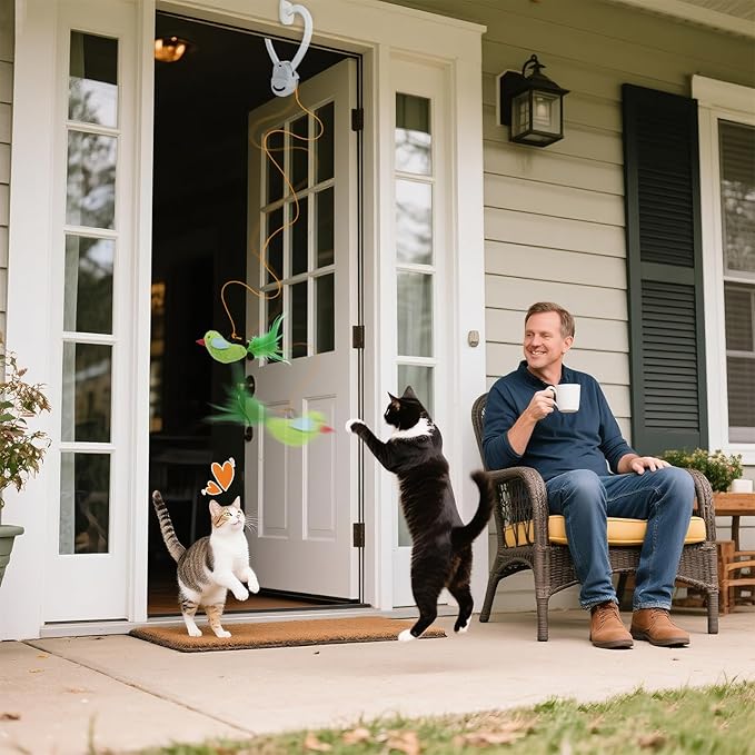 - Interactive Door Hanging Cat Toy – Flying cat toy for indoor cats and outdoor Cats Keep your feline entertained for hours with this automatic flying bird cat toys for indoor cats! The lifelike fluttering motion and feather attachment stimulate your cat’s natural hunting instincts, cat bird toy flying perfect for bored indoor and outdoor adult cats and kittens. Cat toys automatically maintain the cat's interest in the toy-If the product automatically stops working after 8 minutes of use, it will not restart unless the elastic cord is touched or pulled.