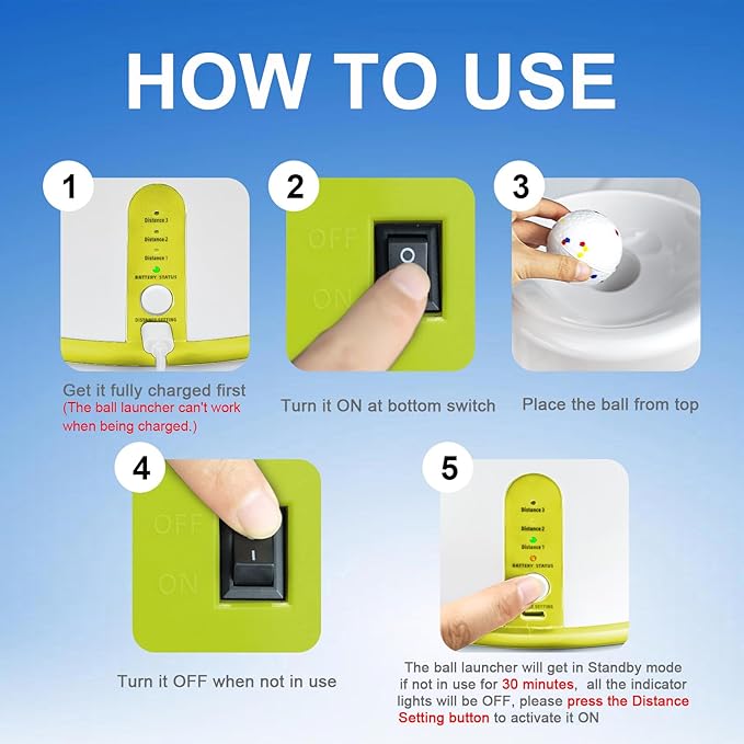 - Standby Mode: The dog ball launcher has a power-saving setting. If it is not used for half an hour, it will automatically enter standby mode, all indicator lights will turn OFF and it can't work. Please just press the Distance Setting button to reactivate the device.