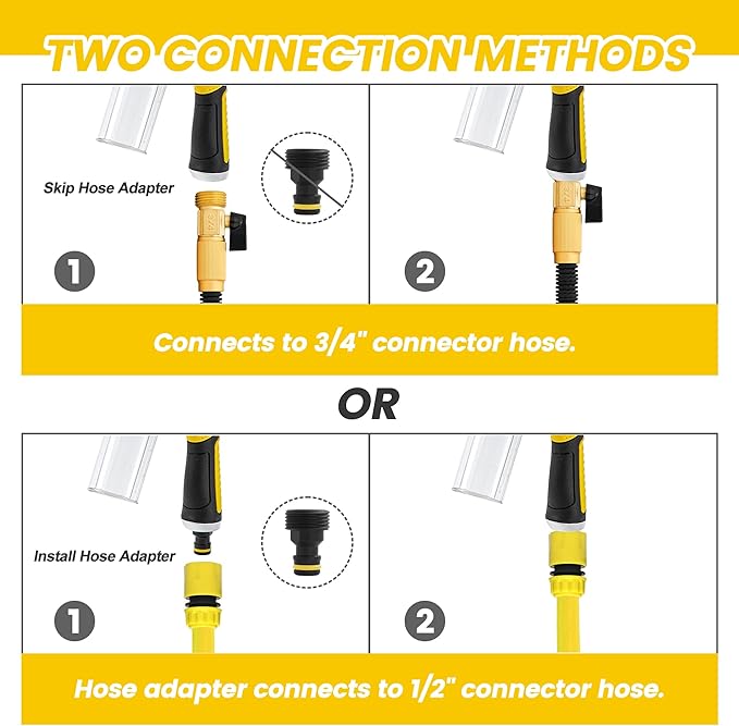 - 【Complete Cleaning Kits】This soap sprayer fits all standard American garden hoses with 3/4 inch garden hose thread (GHT). No adapter required, just connect and go! You can also use a quick connect to connect a 1/2 inch garden hose.
