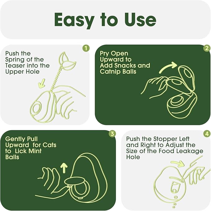 - 4 ways to play: Put your cat's favorite snacks in it and use it as a food leaking toy. Install catnip balls for your cat to lick (This product does not contain peppermint balls). The tumbler design can swing left and right. The mini cat teaser design, the spring and leaves swing, making a crisp bell sound. 4 ways to play stimulate your pet's playful nature and enhance their entertainment.