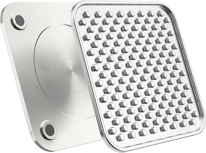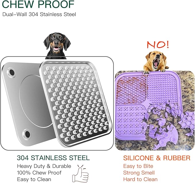 - DUAL-WALL 304 STAINLESS STEEL: Crafted from 304 food-grade double-layer stainless steel, this lick mat is ultra-durable, chew-proof, and built to last. Its seamless design ensures easy cleaning and is 100% safe and hygienic for pets. Still using flimsy silicone mats that get chewed up? Stainless steel is the superior choice.