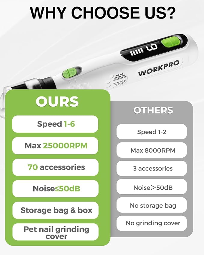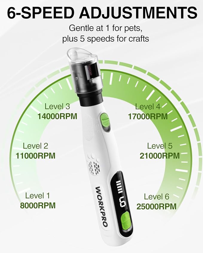 • SAFE & EFFECTIVE GRINDING: WORKPRO pet nail grinder quiet for dogs and cats includes sanding sheets for dogs and grinding wheels for cats. With the protective guard, it ensures safer, effective nail care for all pets