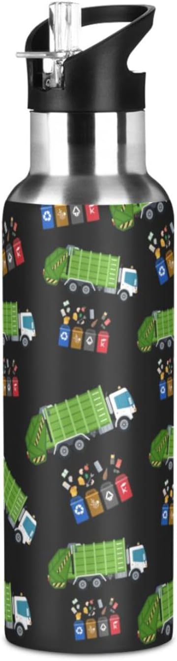 Garbage Truck Trash Recycling Water Bottle with Straw Lid Kids Insulated Stainless Steel Water Flask Sports, 20 Oz Hot Cold