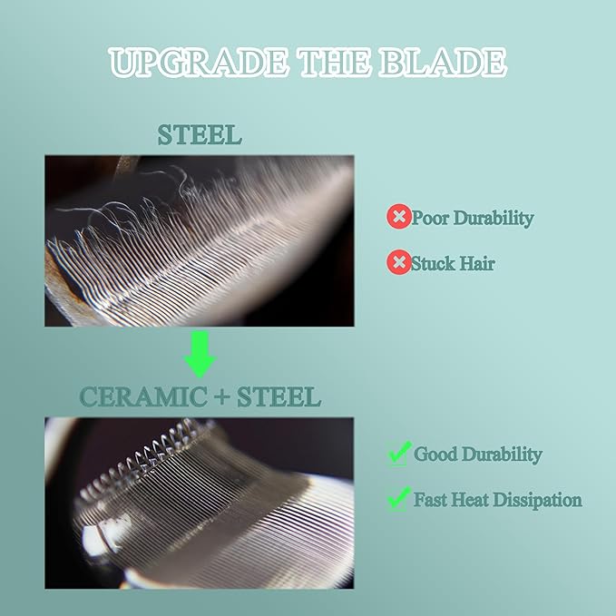 - Ceramic-Stainless Hybrid Blades Trimmer for grooming combines a stainless steel outer layer with a ceramic-coated inner blade to reduce friction and prevent overheating, ensuring safe, irritation-free grooming even during extended use.