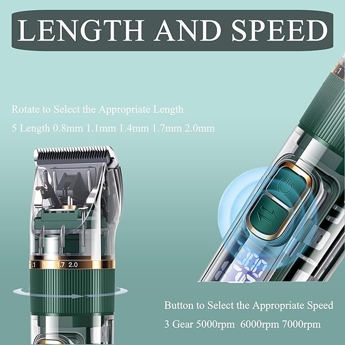 - 3-speed Adjustable Pet Grooming clippers (5000/6000/7000 RPM) Clippers and trimmers set tackle thick hair, coarse fur, or delicate areas with precision—switch between low (5000 RPM) for sensitive zones and turbo (7000 RPM) for stubborn coats without snagging.