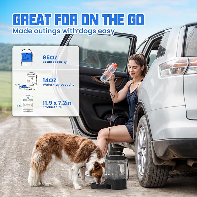 - 95 OZ Large Dog Water Bottle: Enhance your outdoor adventures with lesotc's oversized 95 oz dog water bowl dispenser. Perfect for camping, hiking, road trips, beach days, or dog park visits, our large capacity travel water bowl for dogs ensures your pet stays hydrated. Essential for your dog's health in hot weather and after active play, it minimizes refills and extends your time outdoors with your furry companion
