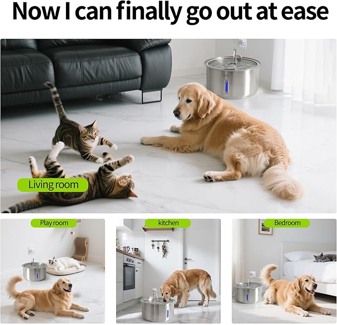 - Silent Harmony & Seamless Integration: Engineered with ultra-quiet ≤35dB operation and an energy-efficient pump that runs 24/7 with a gentle hum, blending naturally into any home environment to maintain tranquility day and night. Versatile setup & effortless use designed for flexible placement in living rooms, bedrooms, or pet corners, featuring a standard outlet plug-and-play setup to effortlessly create a hydration oasis for pets.
