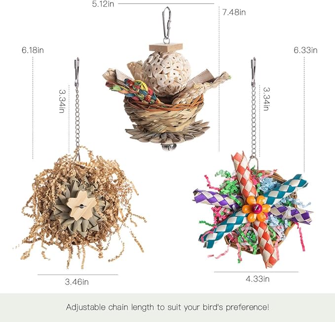 - 3.Beak Workout and Enrichment Essential. 360° shreddable surfaces satisfy parrots' instinctive chewing needs (reduces feather-plucking by 40% in trials).Ideal toy size: 3.54" height fits cages with 1.18"-2.36" bar spacing