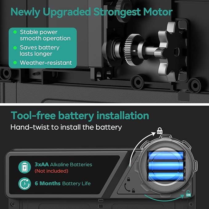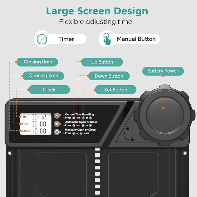 - 【Efficient Battery Power & Smart LCD Screen】This chicken coop door is powered by batteries, making installation a breeze—no complicated wiring required. The automatic chicken door runs for up to six months on three AA batteries (not included; alkaline batteries recommended).The battery compartment is designed for convenience: simply twist to open, no screwdriver needed, and and a low-battery indicator flashes to remind you when it's time to replace them. The bright and clear LCD display ensures easy operation for everyone. No complicated programming – just a quick and easy setup.