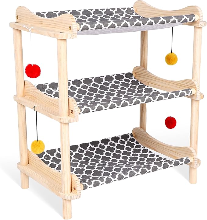 Large 3-Layer Cat Hammock Bed, 24"x15.7"x26.8" Elevated Cat Bed with Pine Wood Frame, Breathable Washable Covers, Wooden Pet Furniture for Indoor Cats and Small Animals(Grey, 3-Tier)