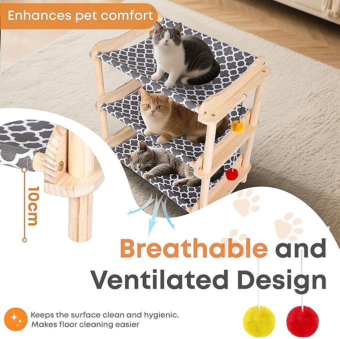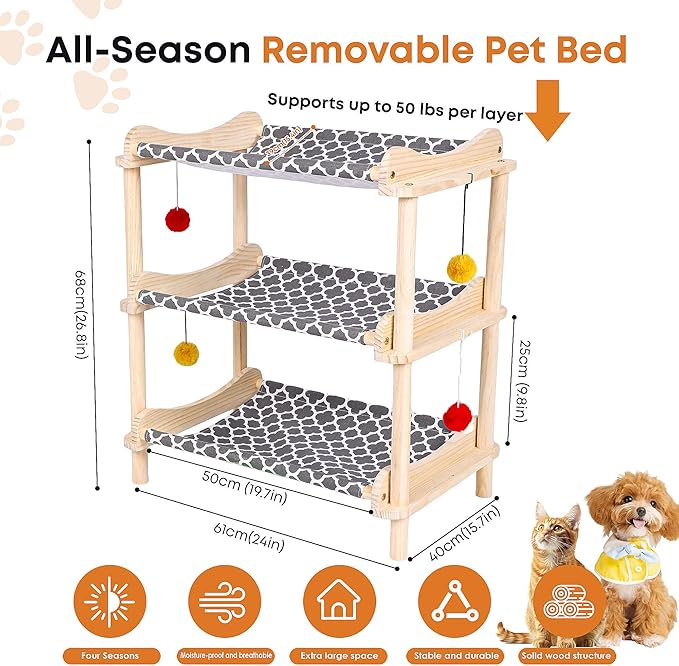 - Strong & Stable – Holds Up to 50 lbs The elevated cat bed is built with a reinforced structure that supports up to 50 lbs per layer. Cats can jump, roll, and stretch freely without wobbling—ideal even as a cat hammock for large cats or a secure elevated dog bed for small breeds