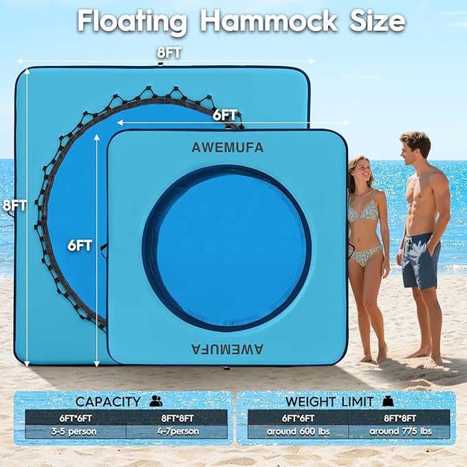 - ROOMY INFLATABLE ISLAND FOR GATHERINGS: The 6 x 6 ft inflatable dock provides ample space for 3-5 people, with a total weight capacity of up to 600 lbs. It includes a removable 4 x 4 ft elastic mesh net that can comfortably accommodate 3-5 people, offering a versatile area for relaxation or activity. Ideal for hosting lakeside or beachside parties, this dock is a great addition for families and pet owners seeking a fun and comfortable water platform